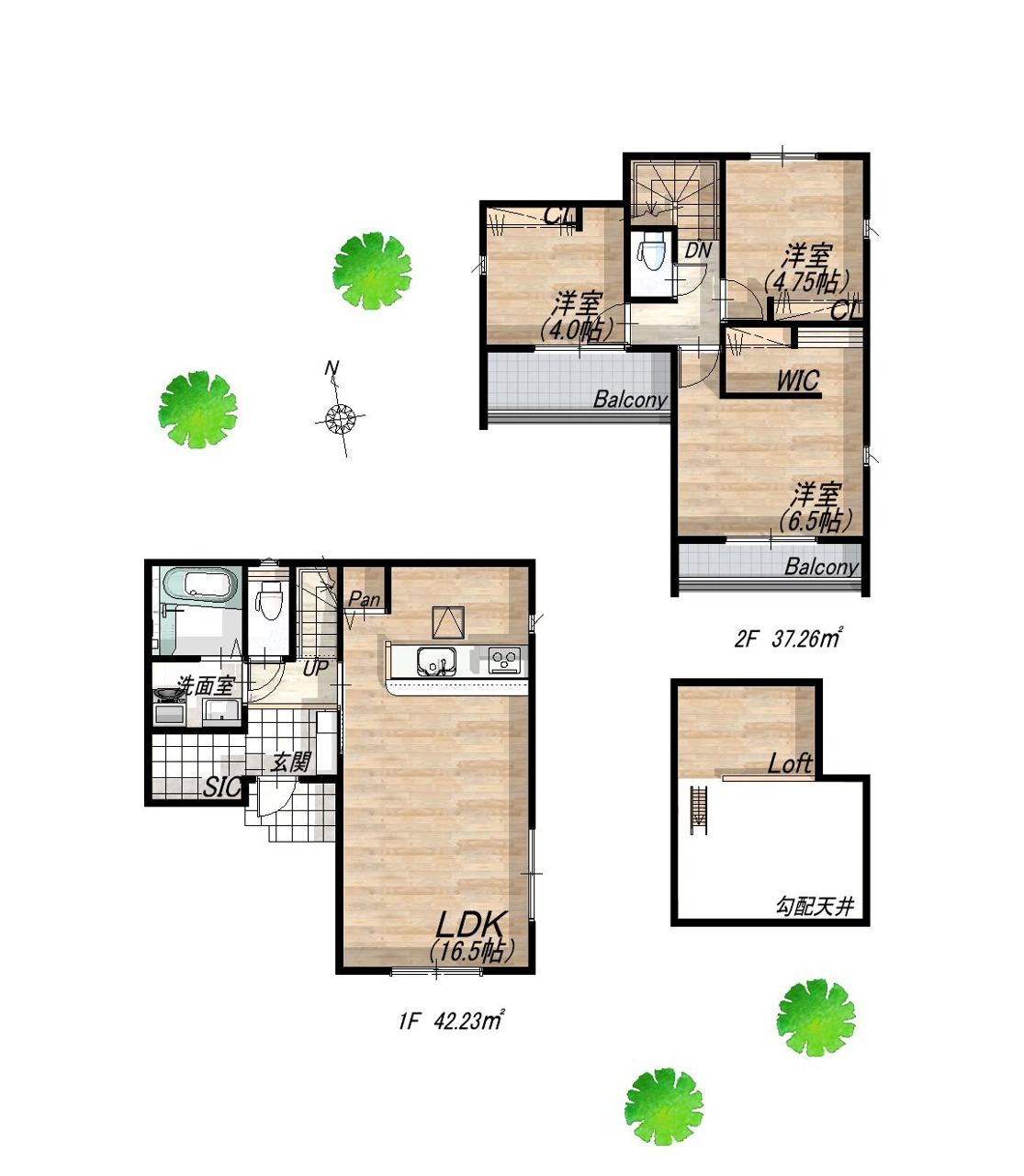 - ※完成予想図はいずれも外構、植栽、外観等実際のものとは多少異なることがあります。